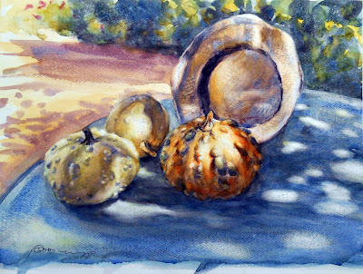 Luz de noviembre sobre tres calabazas.